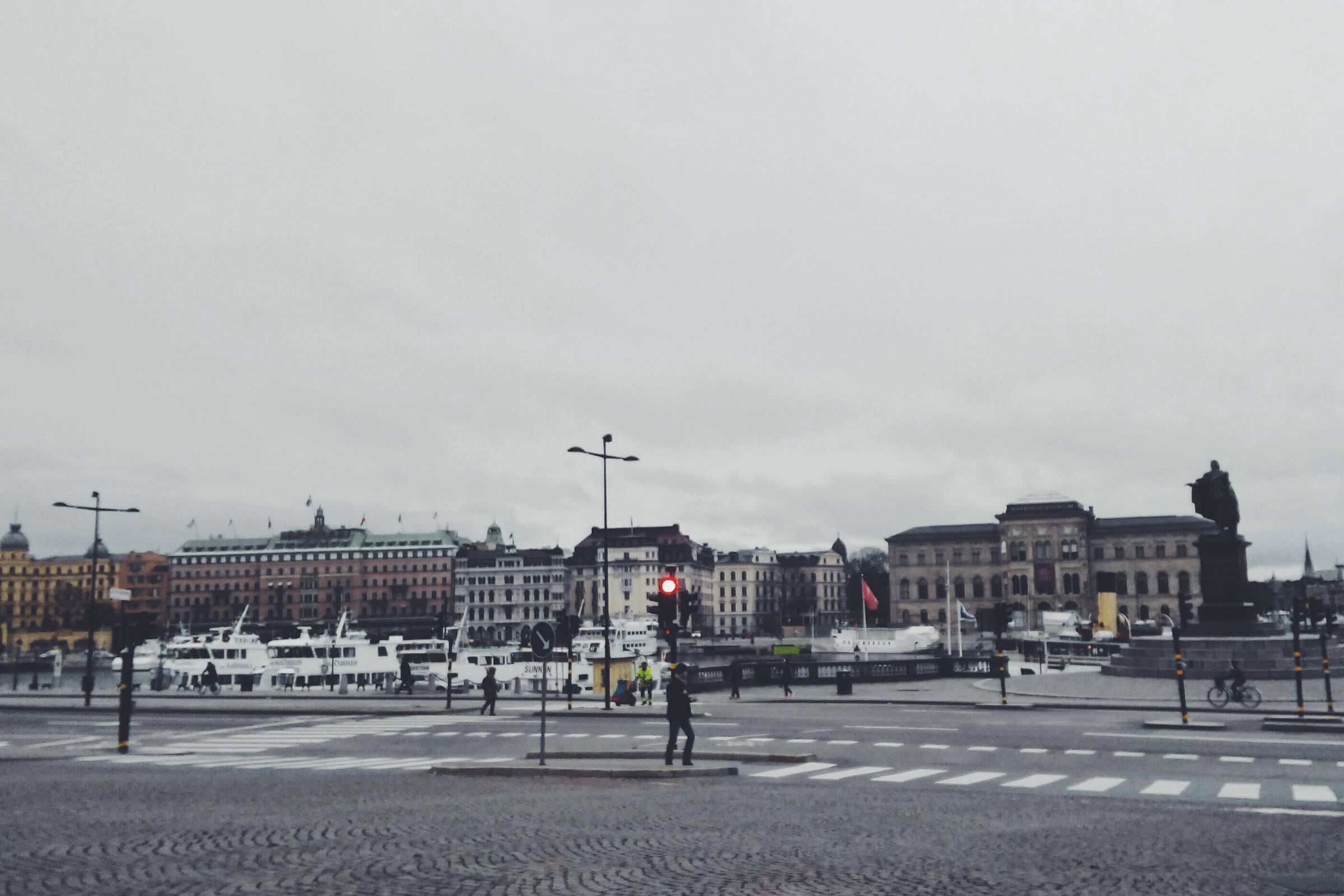 Susana di sekitar Skeppsbron di pagi hari, tampak Museum Nasional di kejauhan.